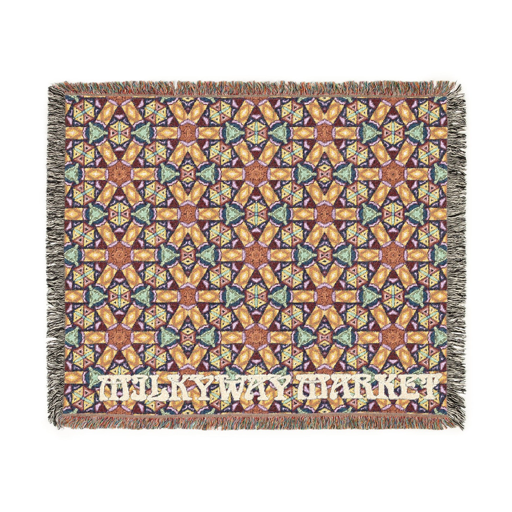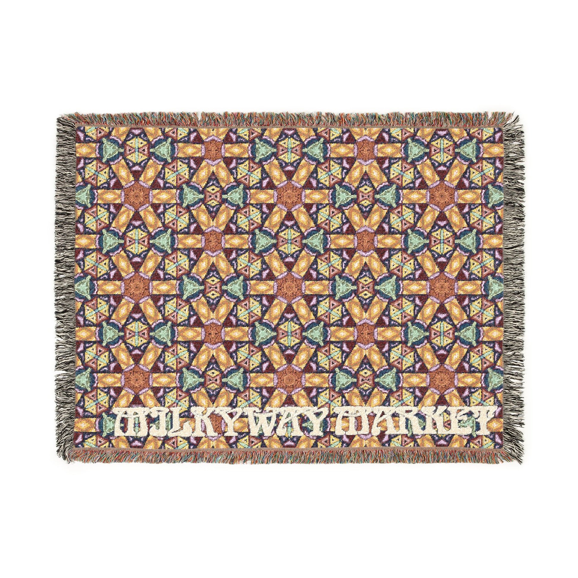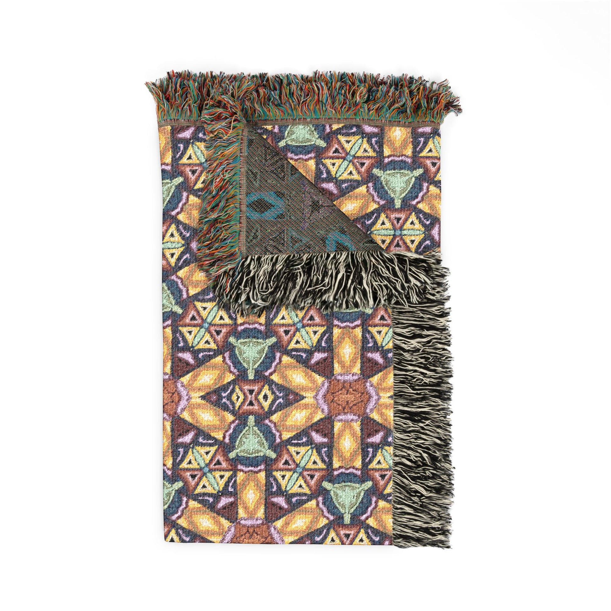 This woven blanket brings a cozy, artisanal energy to living rooms, reading nooks, and camper seats. The dense cotton weave reveals a repeating, kaleidoscopic pattern that reads like stained glass from a distance and reveals intricate, colorful threads up close. Fringed edges add a handmade, tactile finish that frames the design and invites you to curl up under its weight on cool evenings. Choose the Artwork variant for bold, crisp color blocks or the Photo variant when your design needs subtle gradients—the result is a decorative throw that feels both familiar and unexpectedly vibrant.